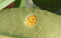 主要為害成熟或近成熟葉片。葉片染病葉背面現(xiàn)黃色、裸露的夏孢子堆,大小0.2—0.4mm,圓形至橢圓形,包被破裂后變?yōu)槌赛S色,后又褪為淺黃色,在與夏孢子堆對應(yīng)的葉正面現(xiàn)紅褐色斑塊,秋后又形成冬孢子堆,圓形,大小0.2—0.7mm,橙黃色至暗黃色,嚴(yán)重時孢子堆擴(kuò)展至全葉。