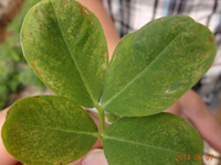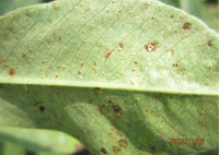癥狀:花生銹病在各個生育階段都可發(fā)生,但以結莢期以后發(fā)生嚴重。主要侵染花生葉片,亦可為害葉柄、托葉、莖稈、果柄和莢果。葉片染病初在葉片正面或背面出現(xiàn)針尖大小淡黃色病斑,后擴大為淡紅色突起斑,表皮破裂露出紅褐色粉末狀物,即病菌夏孢子。下部葉片先發(fā)病,漸向上擴展。葉上密生夏孢子堆后,很快變黃干枯,似火燒狀。葉柄、托葉、莖、果柄和果殼染病夏孢子堆與葉上相似,托葉上的夏孢子堆稍大;葉柄、莖和果柄上的夏孢子堆橢圓形,長1~2mm,但夏孢子數(shù)量較少。