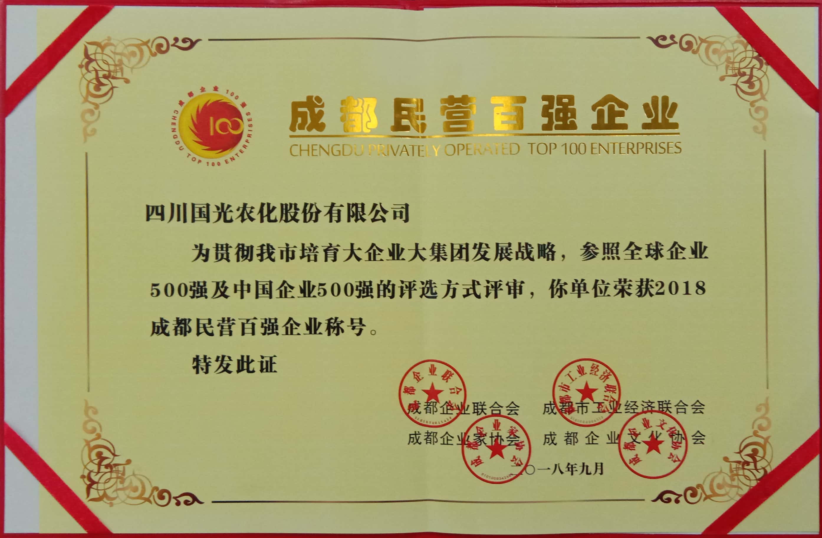 國(guó)光股份憑借優(yōu)異經(jīng)營(yíng)業(yè)績(jī)和強(qiáng)勁增長(zhǎng)勢(shì)頭,獲得“2018成都企業(yè)100強(qiáng)”榮譽(yù)稱號(hào)。