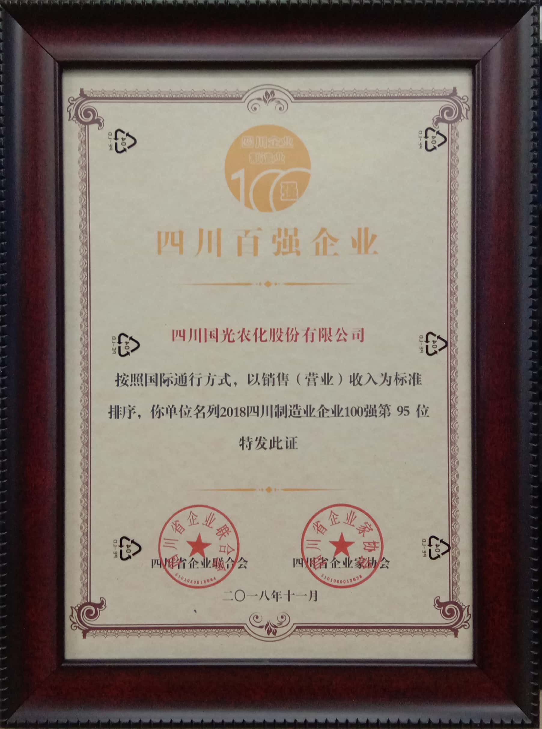 在這次評選活動中,國光股份榮獲“2018四川省制造業(yè)百強企業(yè)”榮譽稱號。