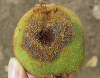 獼猴桃的炭疽病主要為害葉、莖、果實。葉上病斑多呈長形,病斑中間破孔。被害葉片常從邊緣起出現(xiàn)灰褐色病斑,初呈水漬狀,病健交界明顯,逐漸轉(zhuǎn)為褐色不規(guī)則形斑;后期病斑中間變?yōu)榛野咨,邊緣深褐色,其上散生許多小黑點;病葉葉緣向背反卷,易破裂。受侵害枝蔓上呈現(xiàn)周圍褐色、中間有小黑點的病斑。受害果實最初為水漬狀、圓形病斑,逐漸轉(zhuǎn)成褐色,不規(guī)則形腐爛斑,最后整個果實腐爛。受害果實最初為水漬狀、圓形病斑,逐漸轉(zhuǎn)成褐色,不規(guī)則形腐爛斑,最后整個果實腐爛。