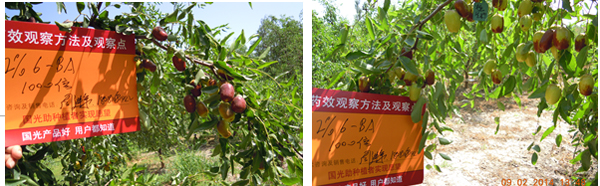 2014年7月,新疆吐魯番伊拉湖鮑秀,在灰棗幼果期噴施國光植生源1000倍+國光優(yōu)豐1500倍,使用1次,成熟期觀察,使用保果膨果套餐灰棗,保果效果好,棗果膨大明顯,且不影響上色成熟,畸形果率少;對產量進行測定,使用保果套餐灰棗增產12%。