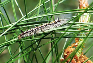 松毛蟲繁殖力強(qiáng),產(chǎn)卵量大,卵多成塊或成串產(chǎn)在未曾受害的幼樹針葉上。1-2齡幼蟲有群集和受驚吐絲下垂的習(xí)性;3齡后受驚擾有彈跳現(xiàn)象;幼蟲一般喜食老葉。成蟲有趨光性,以20時活動最盛。